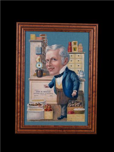 Die-Cut Grocer w/ Large Head on character, fine condition, framed 13 x 18"