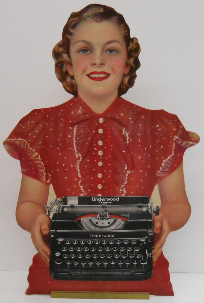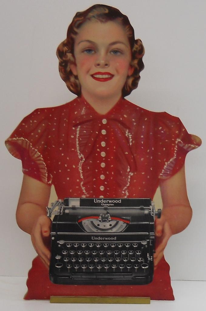 Beautiful die-cut litho sign advertising the Underwood Typewriter. It is an easel-back sign and is 23 inches tall x 15 inches wide at the widest point. The easel has never been unfolded - this sign is as nice as they come.