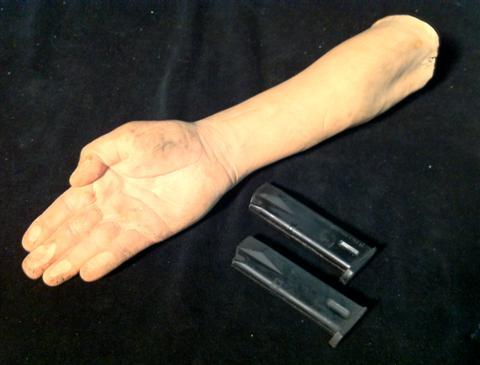 Die Hard (1988) - A heavy prosthetic latex casting of Bruce Willis' hand made for the first Die Hard film for a scene involving broken glass and two rubber stunt gun clips. 17" x 4" x 4"
