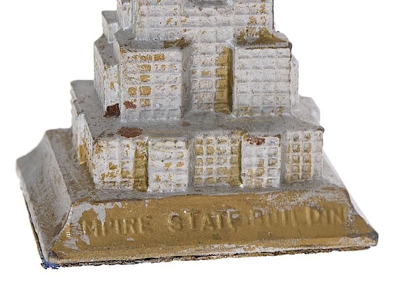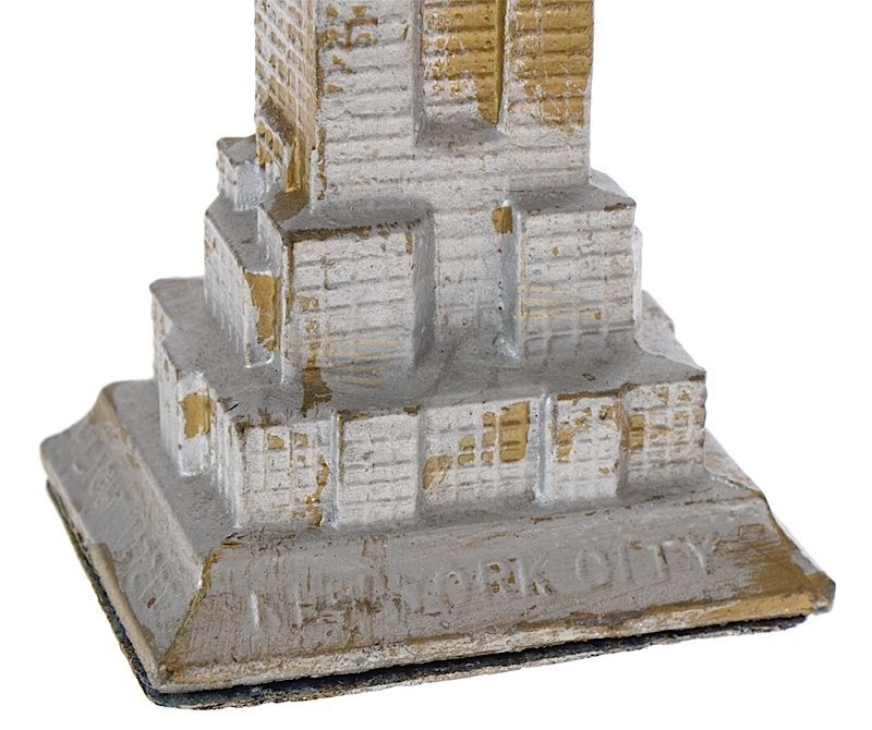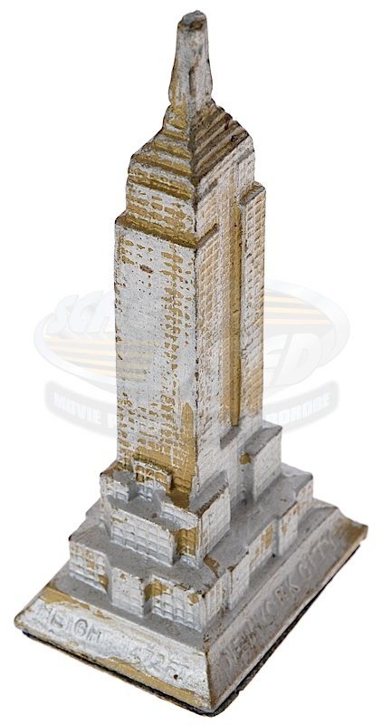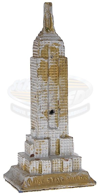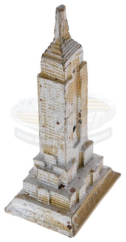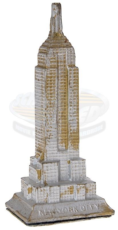 (Twentieth Century Fox Film Corporation, 1995) This prop Empire State Building Miniature was acquired for the production for use by Bruce Willis as "John McClane". The prop miniature was used in two scenes, neither of which made the final cut of the film. The first scene involved the miniature being used as a holder for the Federal Reserve Bank of New York bathroom key. The second scene was an alternate ending, the prop miniature was repainted to look as if it was made from gold underneath the silver paint. In the scene, the miniature was used by Bruce Willis, as "John McClane", as he finds Simon Gruber in a bar and proceeds to explain how he figured out his plan. He scratches the silver paint on this miniature to reveal the gold underneath and tells Simon he knows he melted down the gold from the robbery and made these miniature buildings to smuggle it out of the country and get away. The prop miniature stands 5.25" tall and is made of metal with the gold and silver paint still applied from filming. This was the only prop of its kind used during filming and comes with a letter from the prop master that worked on the film, confirming its use during filming.