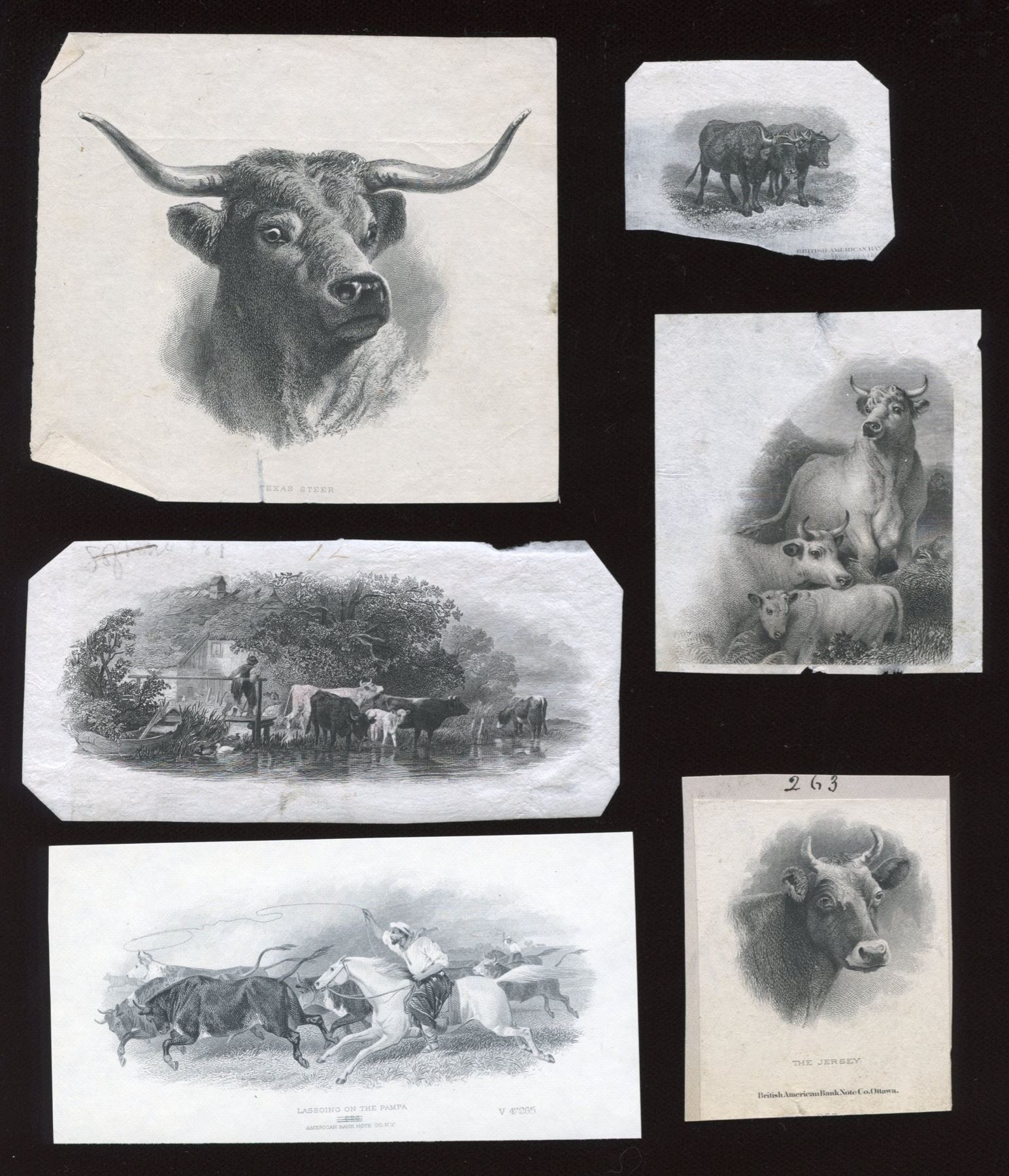 "Texas Steer", tear and folds; "Lassoing On the Pampa"; unnamed, writing and thinning; unnamed (see U.S. Windham County Bank $1); plus these by BABN: pair of black cattle, bottom torn away; Wild Cattle of Chillingham, thinning and small pieces missing; "The Jersey" (#263); "Sark" (#229), not cut down; "Farm Yard" (#257). Nine vignettes.