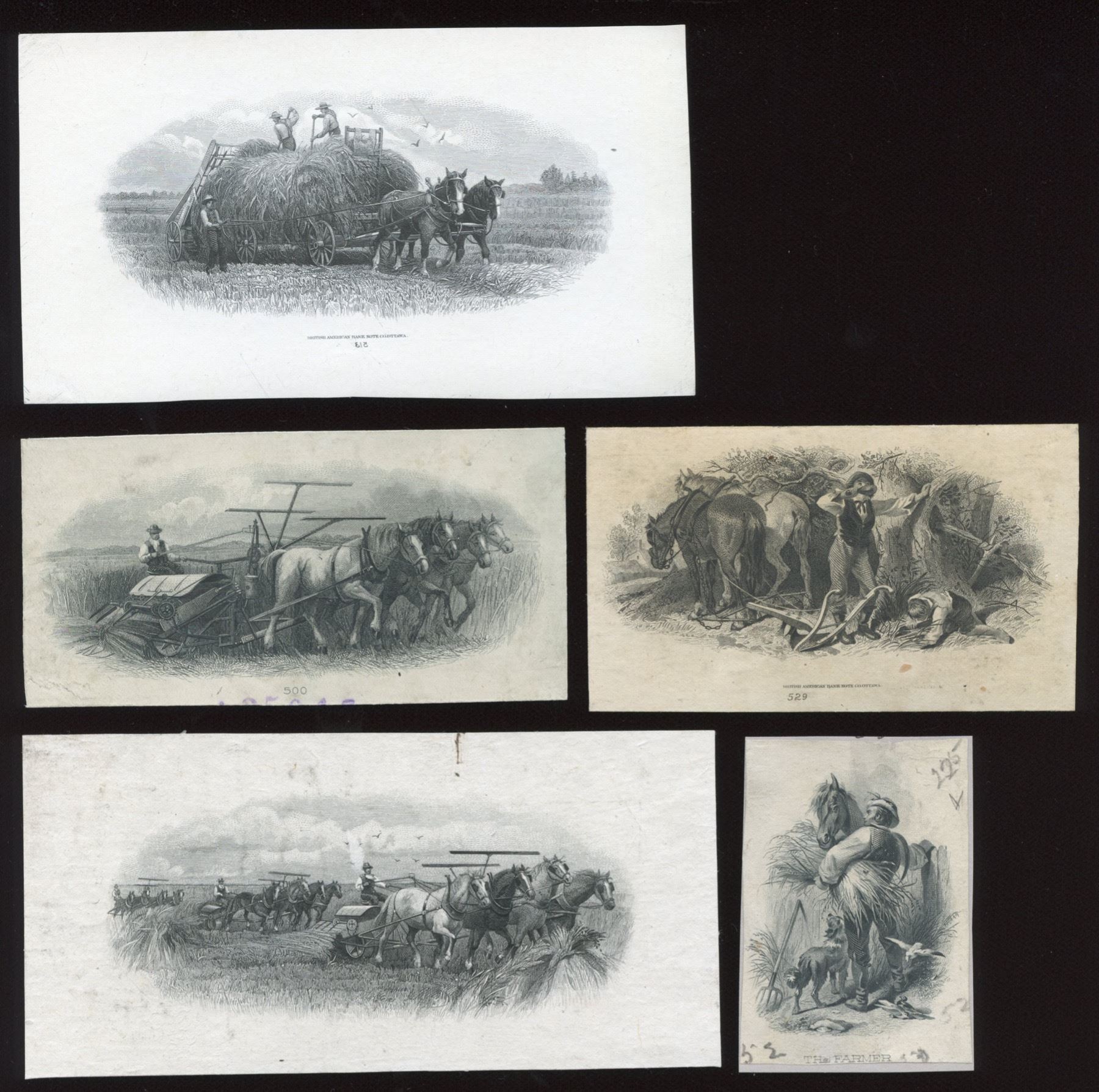 "The Farmer", writing; two different reaping scenes, including "#500" which is probably "Northwest Reaper" by BABN, the other has a mark at top and small paper adhesion; "Loading Hay" (but not named on vignette), BABN #513 on glazed paper; BABN #529, title not available; farmer watering horses.  Six vignettes.