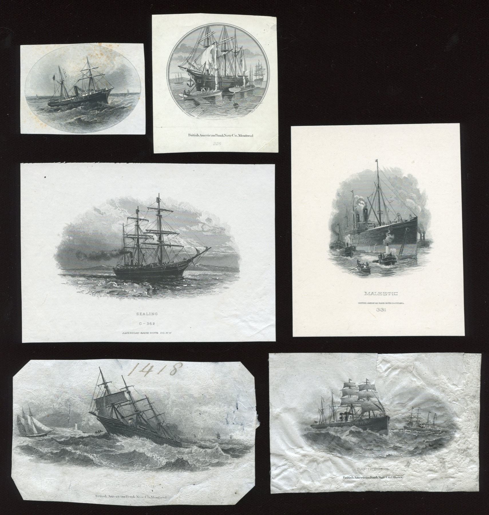 "Majestic", "Sealing", "Homeward Bound", "Loading Cargo" (#225), "Parisian #4" (wrinkled, soiled), and one other not identified. All are cut down; only the first is mounted on card.