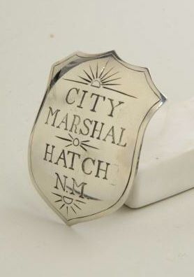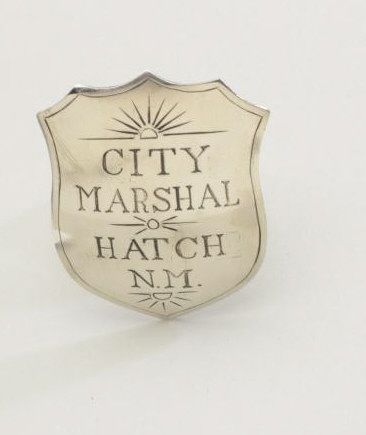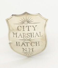 Die struck simple shield badge hand engraved City Marshal Hatch New Mexico, pin back, clasp missing, shows some wear, collected in New Mexico. Est.: $300-$600