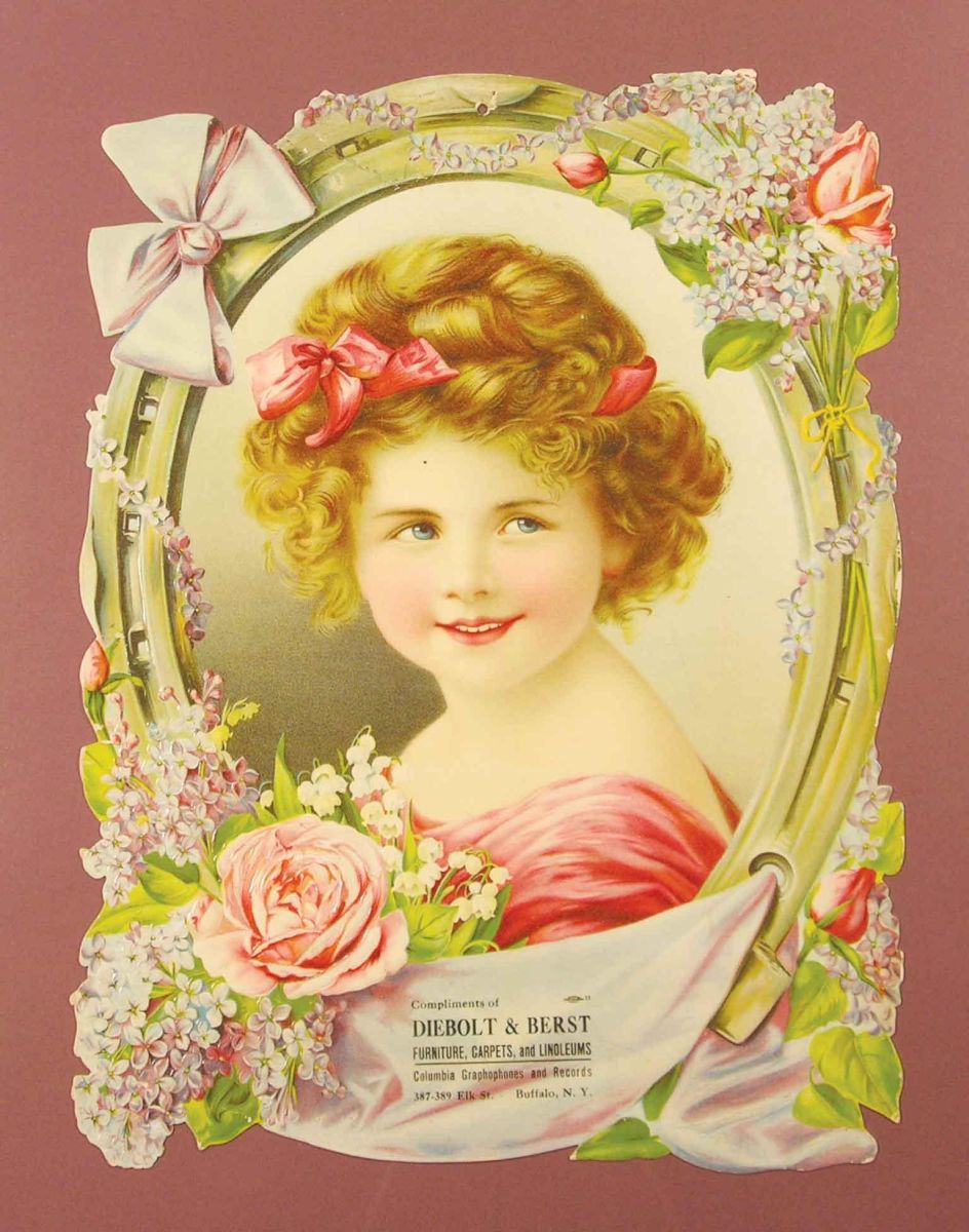 Embossed Die Cut Paper Sign for Diebolt & Berst Furniture and Carpets, Buffalo, NY. A piece missing top right, some minor edge ware otherwise good condition. 12 1/2 X 17 inches image only.