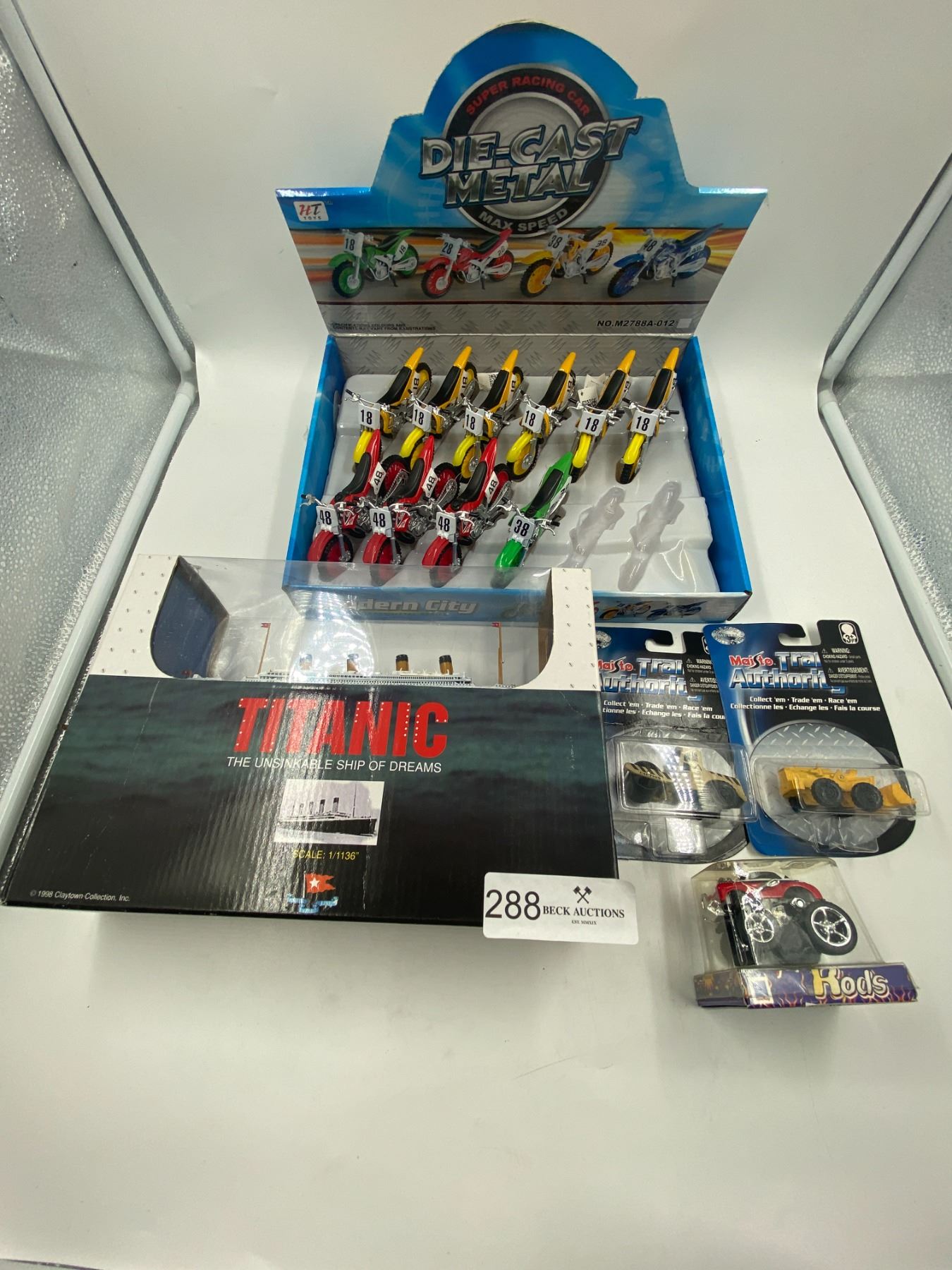 Diecast Collectible Lot of Motor Bikes and Titanic Ship Plus Work Vehicles