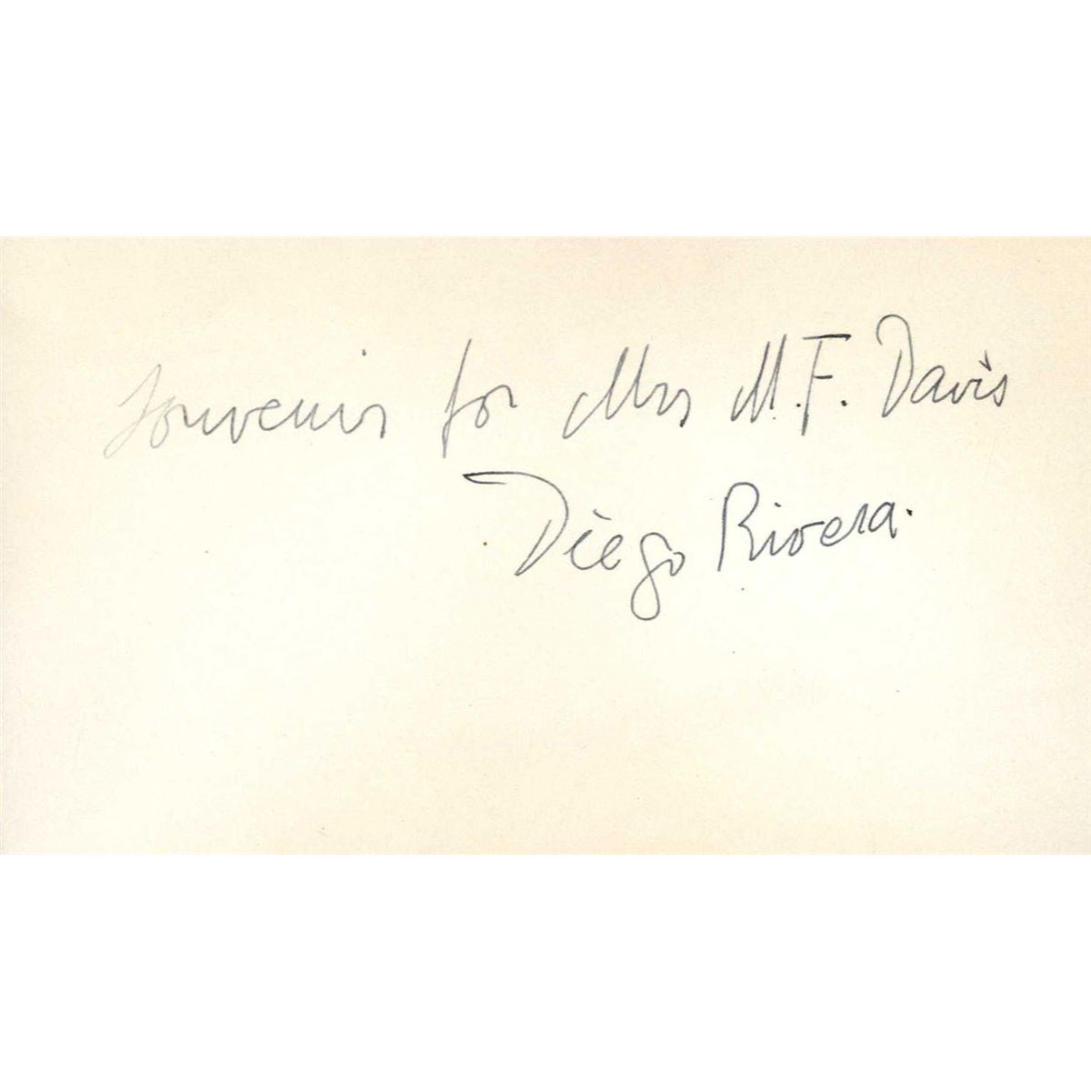 Diego Rivera autograph note signed. Rivera writes, ''Souvenir for Mrs M.F. Davis / Diego Rivera'' upon 5'' x 3'' card. Accompanied by a cover postmarked San Francisco, Calif. 4 Oct. 1940, when Rivera was working on the Pan American Unity mural. He would marry Frida Kahlo in San Francisco later that year. The cover's return address section reads, ''Diego Rivera Mexican painter'' in pencil in an unknown hand. Other notes on the cover read ''Well known'' and ''Air mail.'' Signed card is near fine. 5.5'' x 3.25'' postal cover is very good.