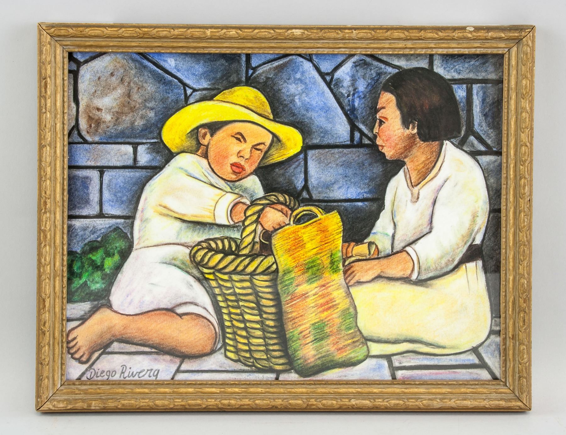 Gouache on paper, featuring two Mexican workers. Signed and attr. to Diego Rivera(Mexican 1888-1957), signature on the lower left corner. Inspired by Renaissance frescoes and motivated by a conviction in the value of public art, Diego Rivera found his calling as a muralist. A visit to the Soviet Union informed his signature earth-toned, Social Realist style. In accordance with his Marxist views, he “made the masses the heroes of monumental art,” painting narrative scenes championing indigenous Mexican culture and workers who toiled in the name of progress. Detroit Industry (1932-3), a 27-panel tribute to the city’s labor force, reveals Rivera’s interest in the form and function of industrial technology. While his concern for the working class resonated in the United States, his inclusion of a portrait of Lenin in Man at the Crossroads (1933), a mural commissioned for Rockefeller Center in New York City, proved highly controversial. PROVENANCE: Southern Ontario Estate. 8.75 x 11.75 in