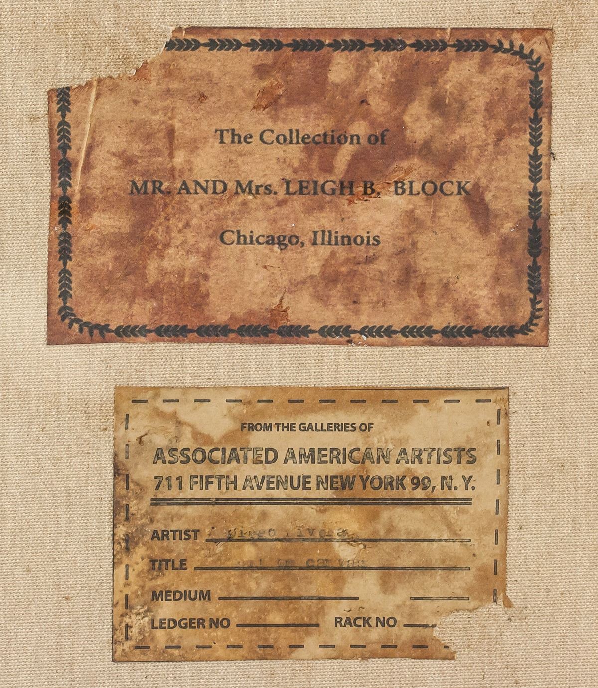 Oil on canvas. Featuring a young girl sitting on the ground with flowers by her feet. Signed "Diego Rivera" in the top left corner. Label affixed to verso reads "The Collection of MR. AND Mrs. LEIGH B. BLOCK Chicago, Illinois". Label affixed to verso reads "FROM THE GALLERIES OF ASSOCIATED AMERICAN ARTISTS 711 FIFTH AVENUE NEW YORK 99, N. Y. ARTIST Diego Rivera TITLE [illegible] MEDIUM LEDGER NO RACK NO". Attributed to Diego Rivera (1886-1957, Mexican). 60 x 39 cm (23.5 x 15.5 inches). PROVENANCE: This lot carries limited provenance from a Southern Ontario estate