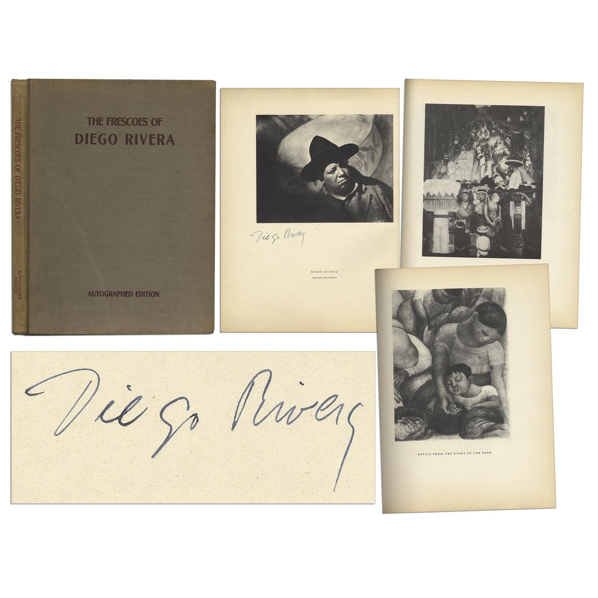Diego Rivera book signed, ''The Frescoes of Diego Rivera'', published by Harcourt, Brace and Company: New York: 1929. Special autograph edition book is signed ''Diego Rivera'' upon the front free endpaper beneath a frontis photo of the artist. Volume runs 144pp., heavily photo illustrated with black and white images of Rivera's paintings and drawings. Bound in putty color cloth boards with brick red lettering. Measures 9.75'' x 12.5''. Toning to leaves and light wear to exterior, with the slightest bend to front board, else near fine. With PSA/DNA COA.
