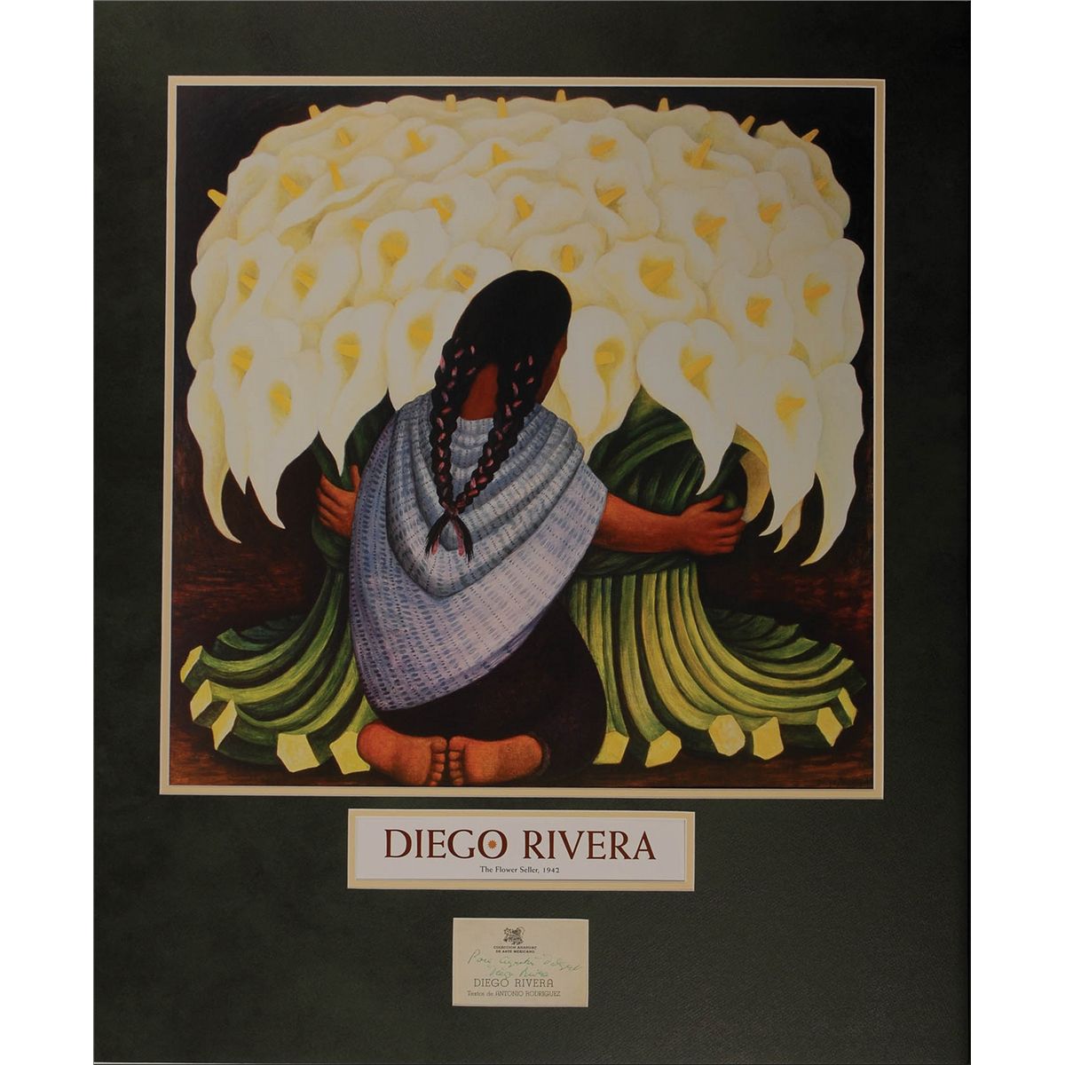 Vintage ink signature and Spanish inscription on an off-white 4.5 x 3 sheet removed from a book. Nicely double matted with an image of Rivera’s The Flower Seller to an overall size of 30 x 36. In fine condition. Oversized.