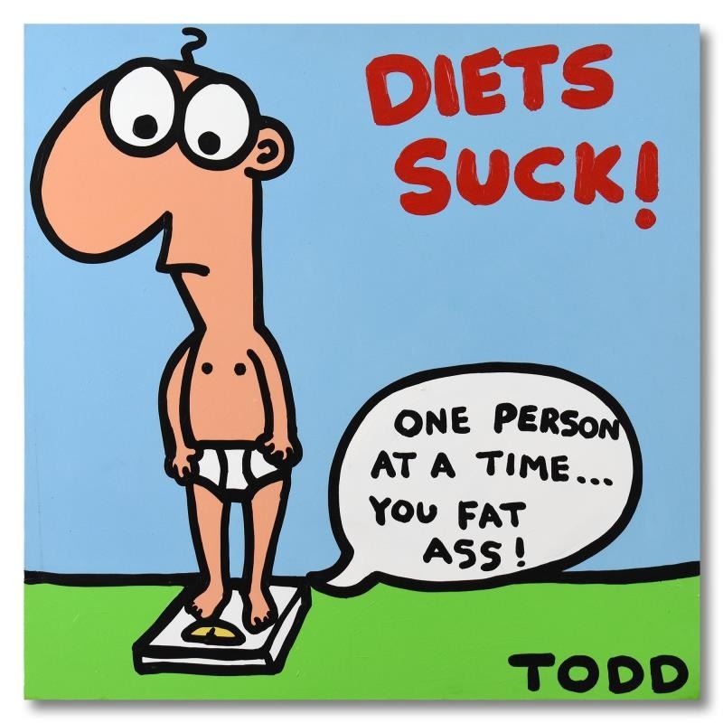 We acquired this piece as part of a larger collection. We do not approve of its inappropriate content. "Diets Suck" is an original acrylic painting on canvas by Todd Goldman, hand signed by the artist. This piece comes gallery wrapped. Includes Letter of Authenticity. Measures approx. 36" x 36" (image). ** Please note: There is minor wear on the corners and edges of this piece, as well as minor scuffs. **
