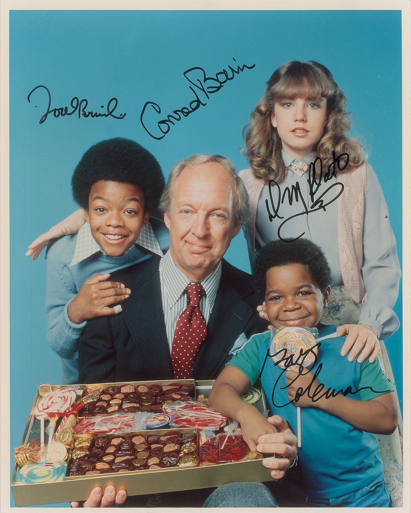 Color glossy 8 x 10 photo of the four stars of Different Strokes, signed in black felt tip by Gary Coleman, Dana Plato, Todd Bridges, and Conrad Bain. In fine condition. Originally obtained by in-person specialist Mike Wehrmann.