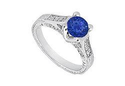 A round diffuse sapphire is center-set atop. Round brilliant-cut white CZs are prong-set in the decorative band. Rendered in .925 sterling silver rhodium this engagement ring has a total gem weight (TGW) of 1.00 carat.