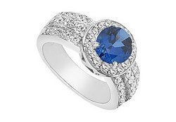 A round diffuse sapphire is prong-set in the center of three round white CZs rows. Smaller CZs are set all around the center stone. Made in 10K white gold this ring has a total weight (TGW) of 3.00 carat.