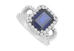 A rectangle shape diffuse sapphire is prong-set between two rows of round white CZs. This bigger center-set stone is encircled by smaller round CZs. Made in 10K white gold this gemstone ring has a total weight (TGW) of 3.25 carat.