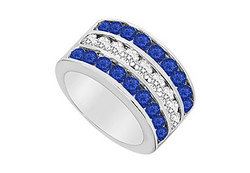 Nine brilliant-cut round white CZs are set in between two parallel rows of round diffuse blue sapphires with channel-set. Made in 10K white gold with a (TGW) of 2.50 carat. This ring has a smooth & wide shank.