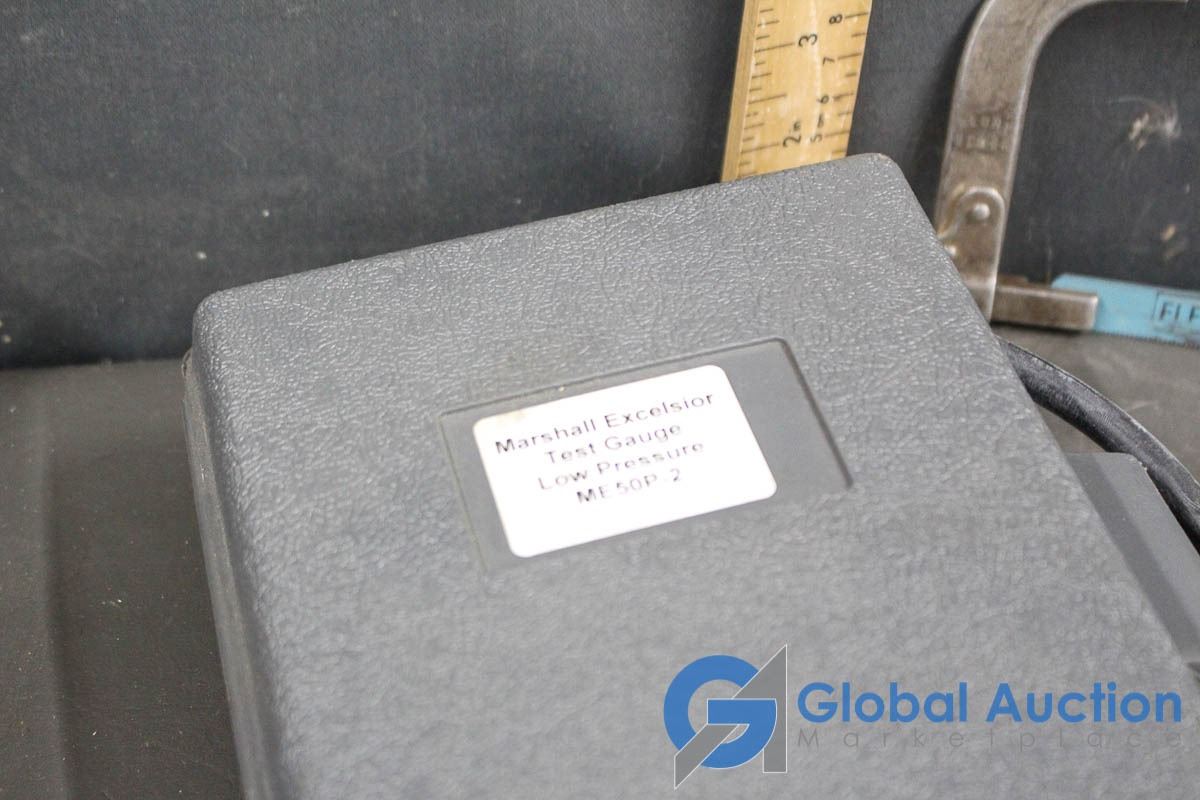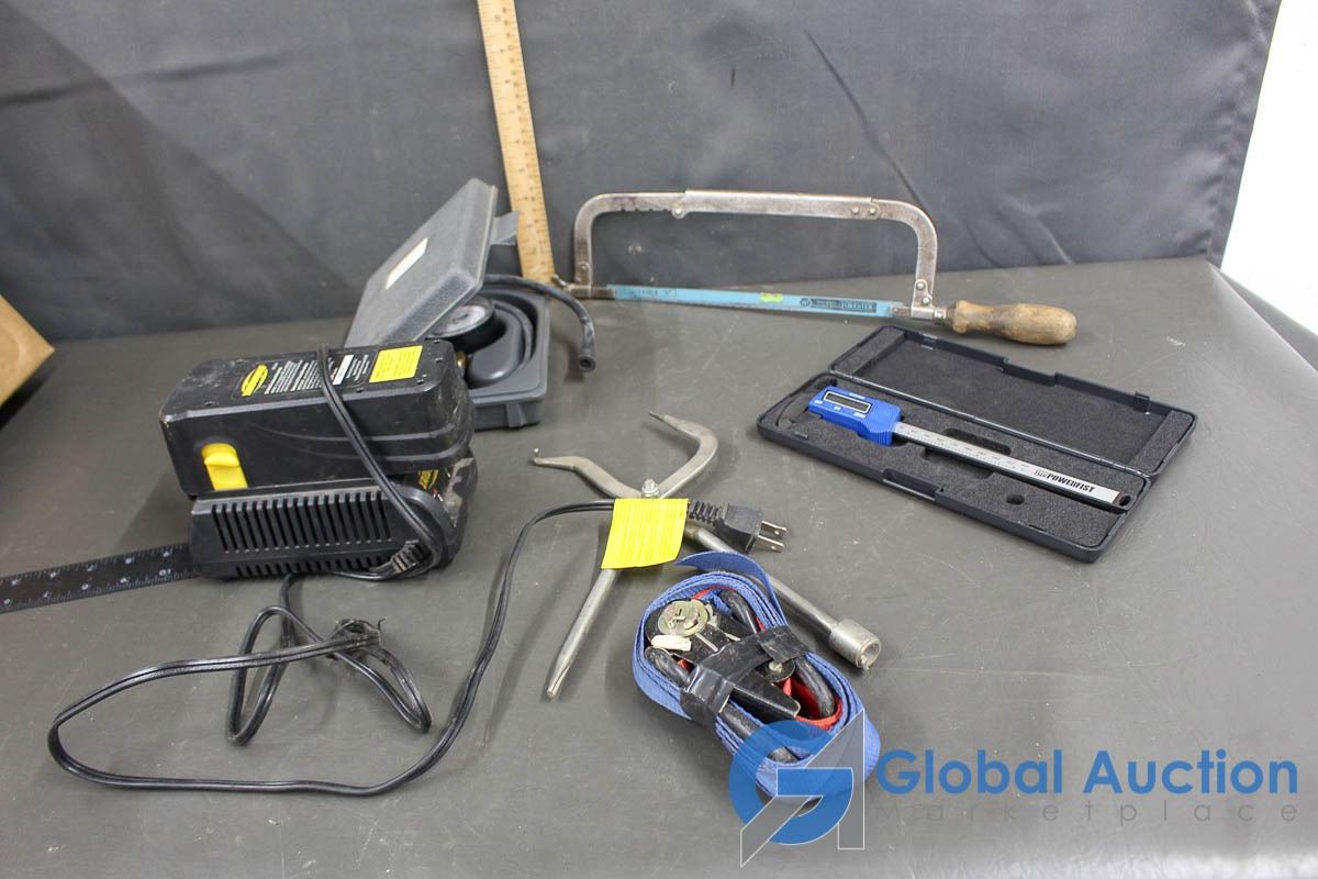 Digital Caliper, Marshall Excelsior Test Guage, Hack Saw, Yardworks Battery