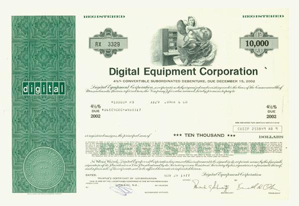 1978, Massachusetts. $100,000 bond bearing interest at 4 ½%. GreenBlack. Engraved vignette of a female figure holding a globe sitting next to an early computer. A nice certificate from a once great computer company. Lightly stamp cancelled on verso. Extremely Fine.