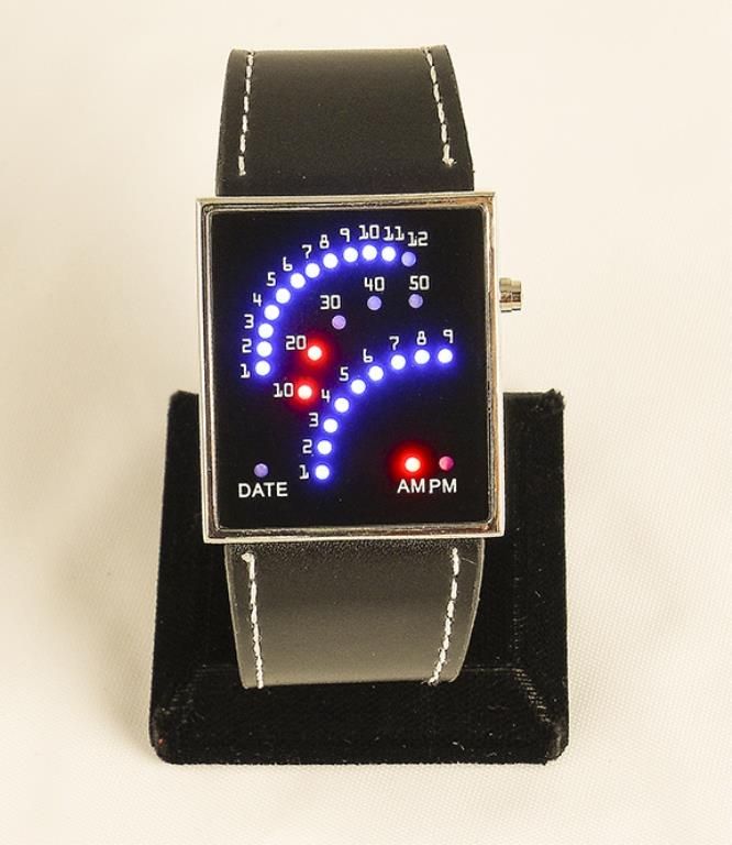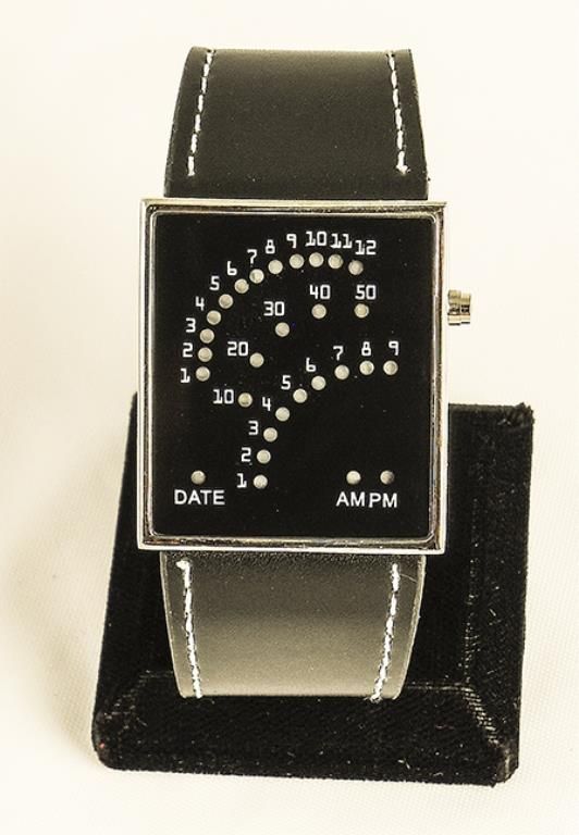 Digital Led Lady's Or Men's Wrist Watch. Cool Retro 70's Style. 29 Led Displays. Watch Has A Black Leather Band Accented With Stainless Steel Case.