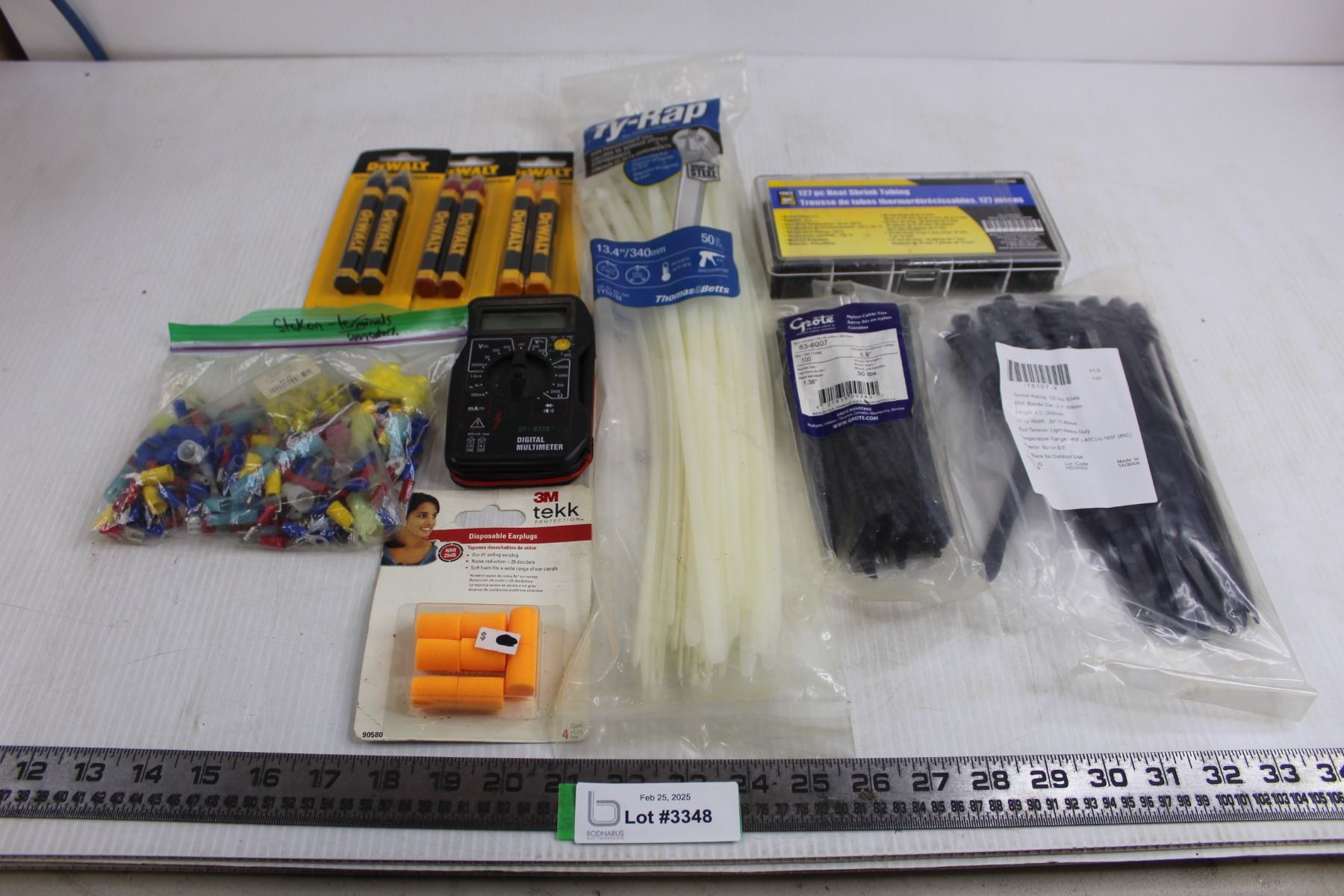 Digital Multimeter, Various Vinyl Tie-Wraps, Dewalt Crayons, Assorted Electrical Terminals/Connectors, Misc.