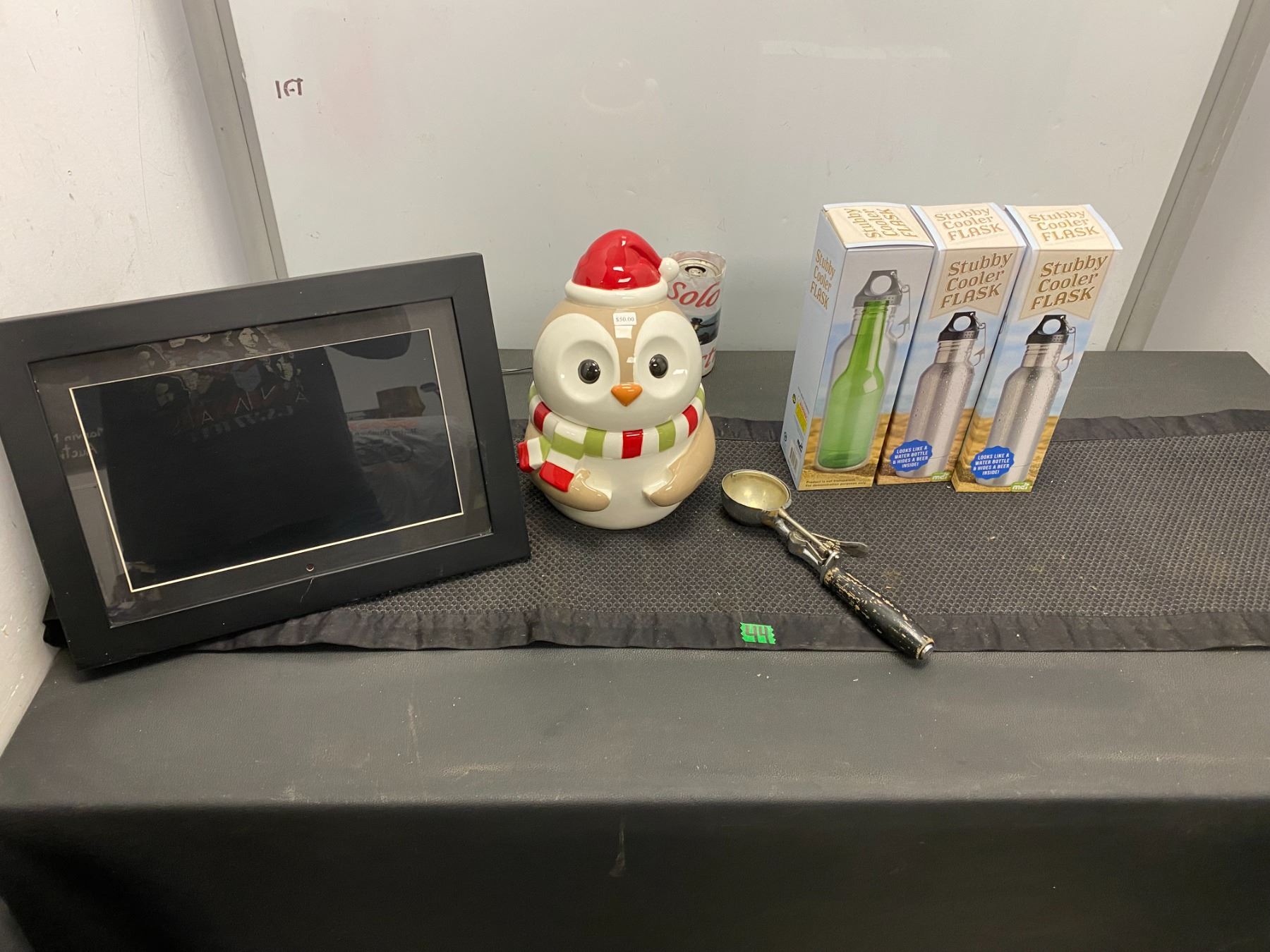 Digital Picture Frame, Cookie jar, ice-cream scoop, and 3 cooler flasks