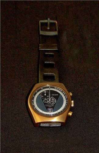 Montre chronographe digitale et calendrier en acier plaqué 10 microns, signée KELEK, automatique, à l’état de neuf, années 1970