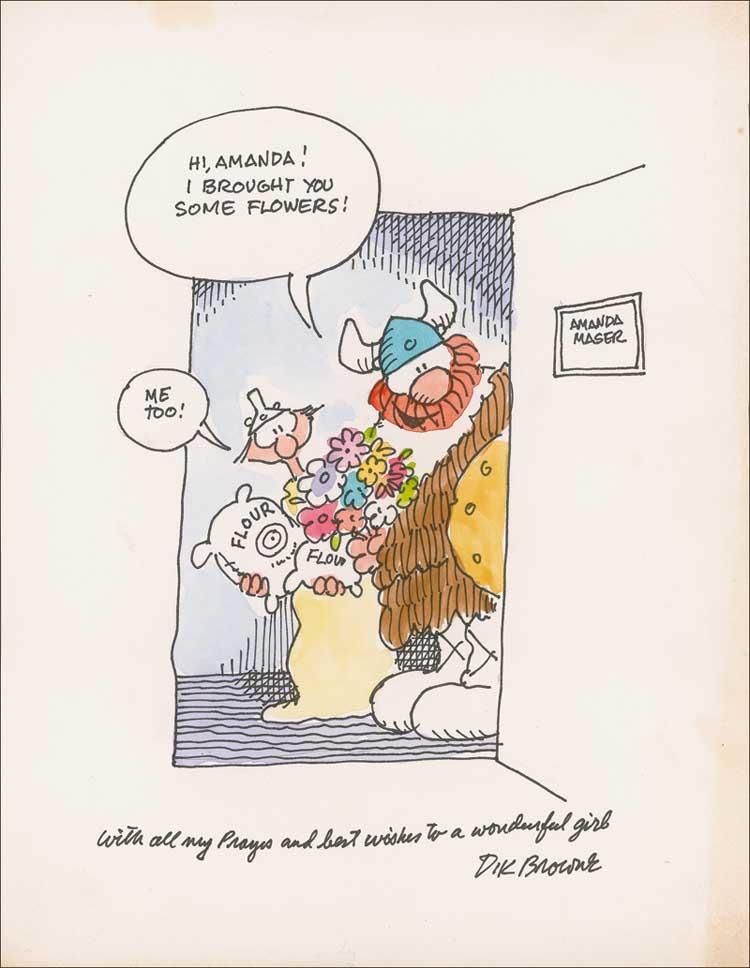 Original signed and inscribed felt tip sketch of Hagar the Horrible and Eddie bearing flowers for the sketch’s recipient on an off-white 9.25 x 12 sheet of cardstock. Signed at the bottom, “With all my prayers and best wishes to a wonderful girl, Dik Browne.” In fine condition, with scattered toning and creasing to borders. RRAuction COA.