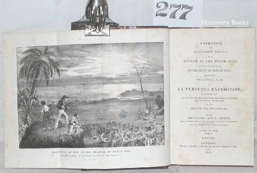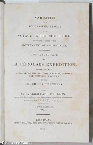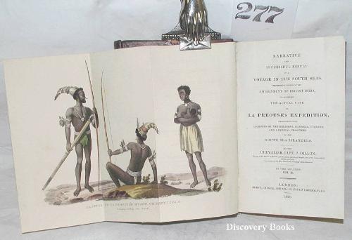 Dillon,Capt. P. NARRATIVE AND SUCCESSFUL RESULT OF A VOYAGE IN THE SOUTH SEA ….. TO ASCERTAIN THE ACTUAL FATE OF LA PEROUSE'S EXPEDITION ….. London: Hurst, Chance & Co. 1829 2 vols lxxviii(2, errata),302; (4, title, halftitle),436pp. Two folding frontispieces, one hand colored, folding map & 1 plate. In recent three-quarters speckled calf & marbled boards, marbled endpapers. t.e.g. Touch of foxing at front vol I, else a very clean, crisp copy in a nice binding. (2)