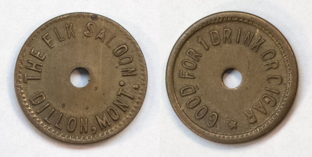 Obv.: The Elk Saloon / Dillon, Mont.; rev.: Good For / 1 drink or cigar. Holed.