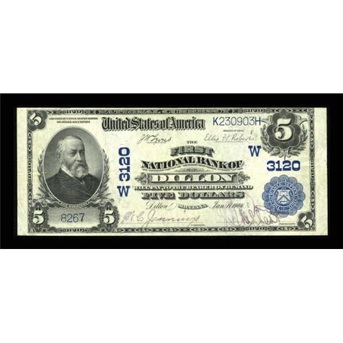 <B>Dillon, MT</B></I> - $5 1902 Plain Back Fr. 598 <B>The First NB</B></I> Ch. # (W)3120<BR> This new to the census large example is one of the nicest notes from the Beaverhead County seat we've seen in recent years. Bright <B>Very Fine, </B></I>with clear signatures.<BR><I>From The Walla Walla Collection</B></I><BR><BR><b>Shipping:</b> Coins & Currency (<a target="_blank" href="http://www.heritageauctions.com/common/shipping.php">view shipping information</a>)