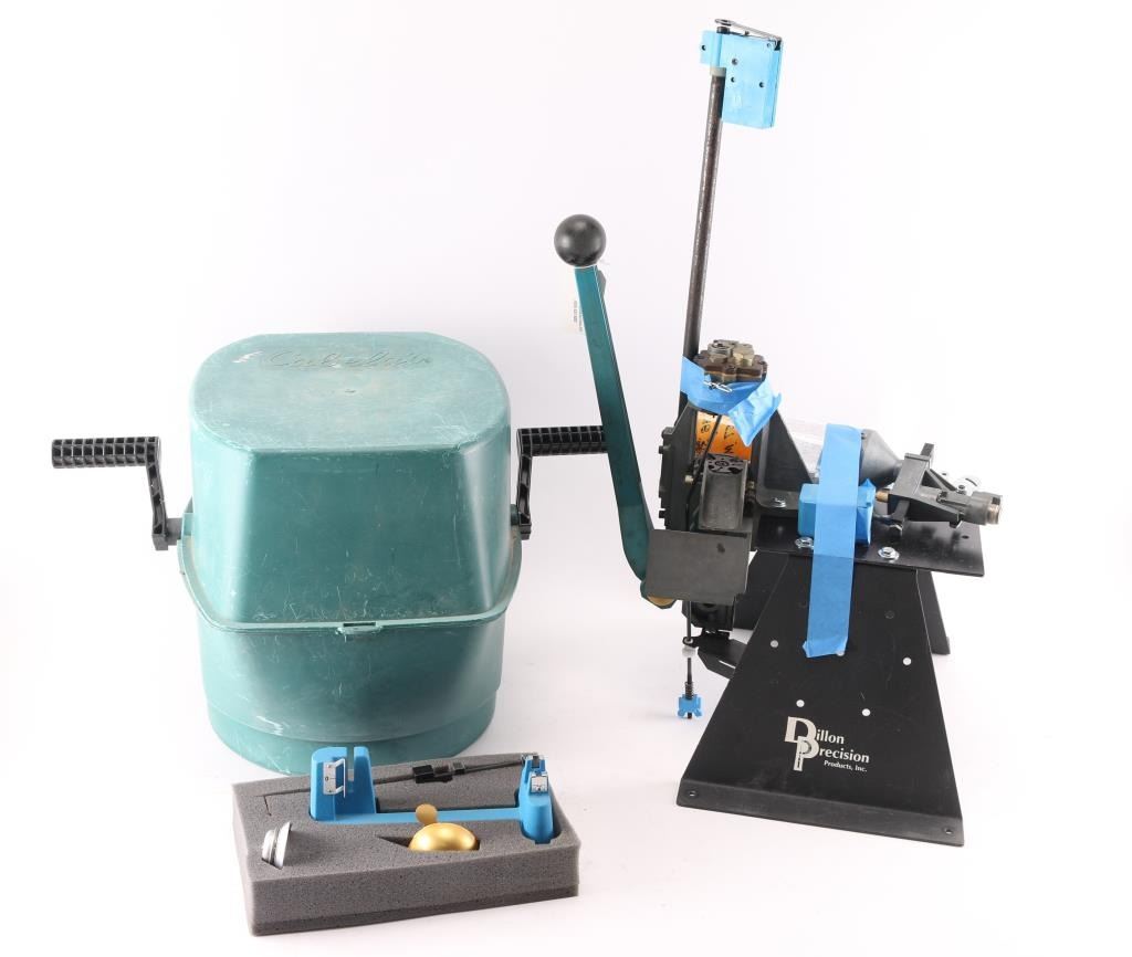 (1)Square Deal B model. The Square Deal B is Dillons most compact machine, it loads common straight-walled handgun and carbine cartridges from .32 S&W Long through .45 Colt. Comes with a black Dillon mount and powder dispenser, Dillon powder scale and Cabelas case tumbler. Powder dispensers has a broken shaft, still in top mount. All in fair to good condition.