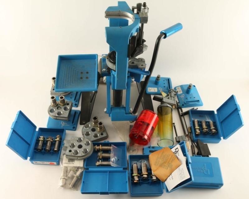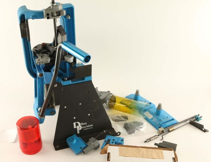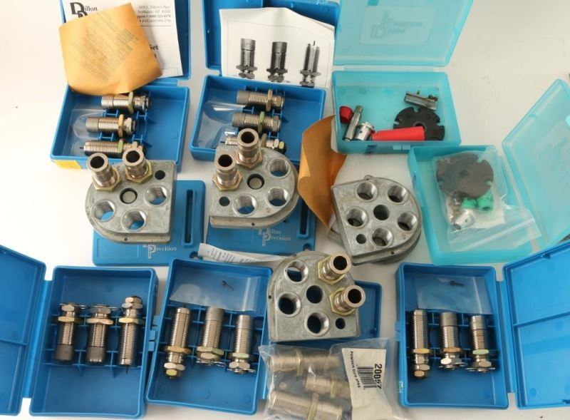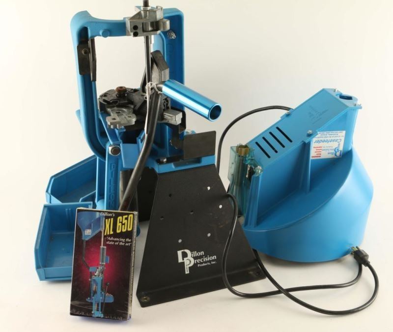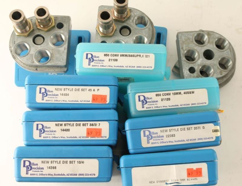 Comes with casefeeder, instruction manual and video tape, spare parts, hardware, case removal kit, bins, and pickup tubes. Dillon Products: Case Gauge 357 Mag, Case Gauge 9mm, 650 Conv 9mm/38Supr-9x21, 650 Conv 45ACP, New Style Die Set 38/357, New Style Die Set 45AC P, New Style Die Set 357/81G, New Style Die Set 10/40, 650 Conv 10mm/40 S&W, New Style 9mm Dies, 3 pack of Powder Dies, Dies for 38 Spl, 45ACP and others. Also includes Lee's 357 Reloading Dies.