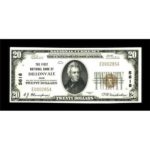 <B>Dillonvale, OH</B></I> - $20 1929 Ty. 1 <B>The First NB</B></I> Ch. # 5618<BR> This note is not in the census, but if it was, it would have the highest grade in the census, large or small, for this Jefferson County bank. <B>Extremely Fine.</B></I><BR><BR><b>Shipping:</b> Coins & Currency (<a target="_blank" href="http://www.heritageauctions.com/common/shipping.php">view shipping information</a>)