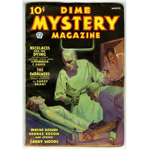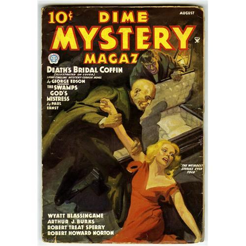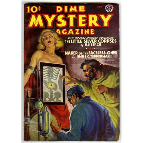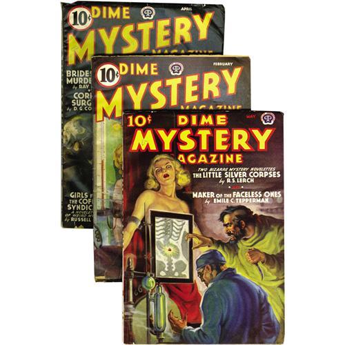 <B>Dime Mystery Magazine Group (Popular, 1935-40).</B></I> A FN+ copy of <B>Dime Mystery</B></I>'s May 1939 issue from the vaunted Yakima Collection is easily the highlight of this group, with off-white pages, an intact spine, and very little tearing along the edges, topped off with a classic mad scientist/girl-in-peril cover. Also included are the August 1935 (GD/VG), March 1936 (VG+), October 1938 (GD, classic cover, format changes to "defective-detective" tales), and February (VG, classic cover) and April (VG, classic cover) 1940 issues. Approximate Bookery's Guide to Pulps value for group = $650.<BR><BR><b>Shipping:</b> Books & Catalogs (<a target="_blank" href="http://www.heritageauctions.com/common/shipping.php">view shipping information</a>)