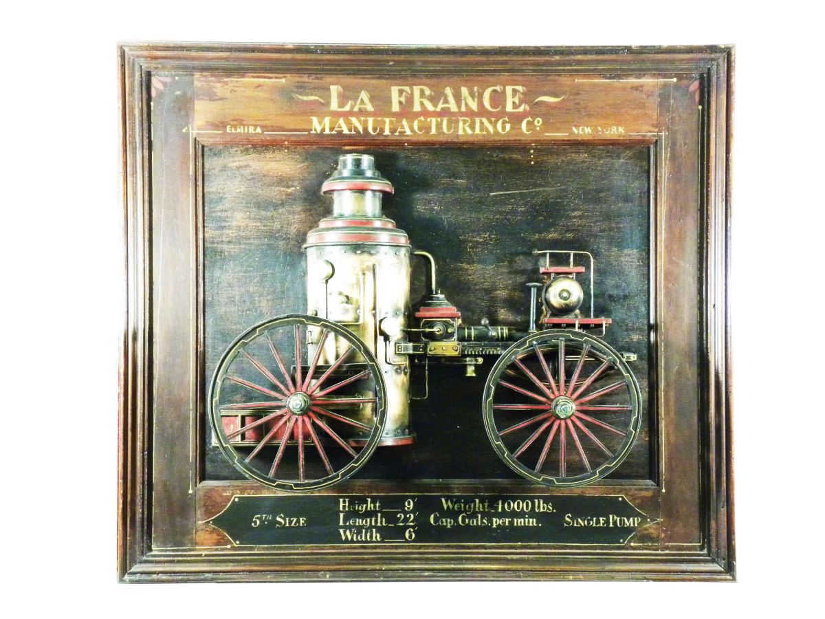 Firemen's Dimensional Sign for La France Mfg. Company New York. Depicting 5th size Single Pump Steam Fire Engine. Purportedly used in display at one of the early national expositions. 42 X 39 X 7 inches.