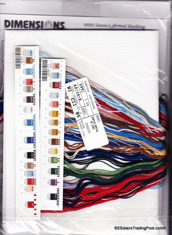Santa's Arrival Stocking' designed by Hal French for Dimensions-Crafts. Kit contains wool yarn, cotton thread, 14 count white Aida cloth, felt, needle and instructions with an alphabet, finished stocking measures 16" long. MSRP $24.95