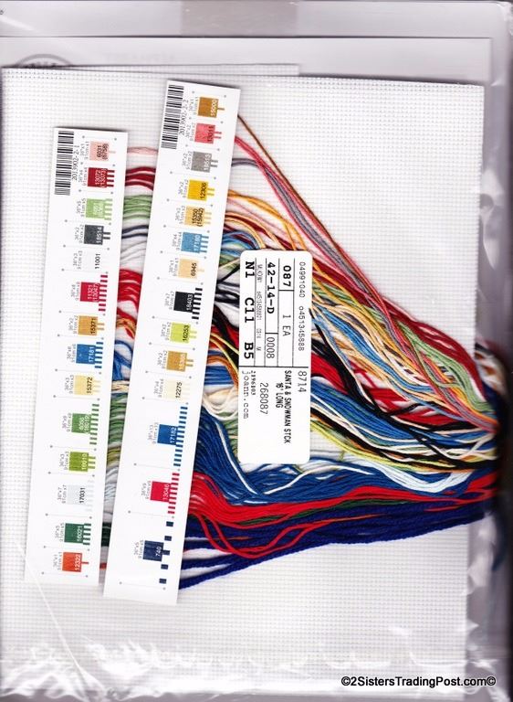 Santa & Snowman Stocking' designed by Vicky Howard for Dimensions-Crafts. Kit contains wool yarn, cotton thread, 14 count white Aida cloth, felt, needle and instructions with an alphabet, finished stocking measures 16" long MSRP $24.95