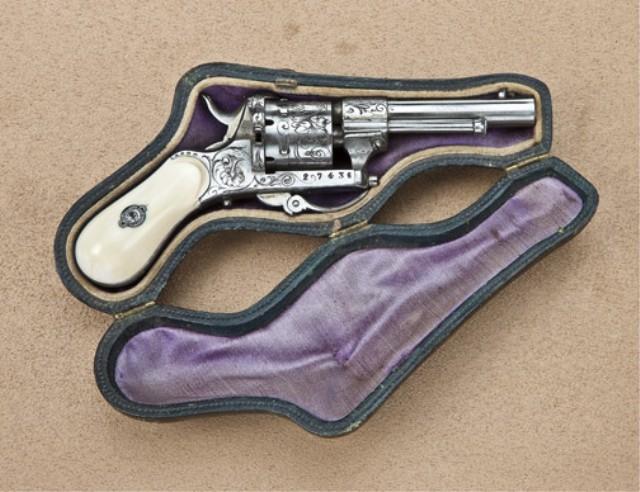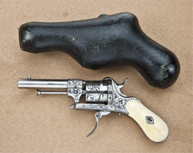 Diminutive pin-fire revolver, engraved with ivory grips in original pipe case showing Belgian proof, serial number 227436. The pinfire is 5.5mm, shows 6-shot cylinder, folding trigger, measures only 5-5/8” overall, is nicely engraved with a brigh or satin grey polished metal finish and was never nickled. The grips show slight yellowing with a couple of minor cracks but are near fine. The pistol is contiained within its original to the period velveteen and satin lined form-fitted pipe case. The case is very good plus to near fine condition showing just some slight scuffs. The interior is near excellent with just some slight fading. A nice pinfire in an exceptional case. Est: $1,000 - $2,000