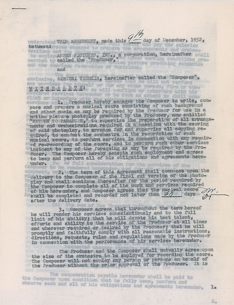 Academy Award–winning composer of over 140 film scores, including High Noon, Giant, and The Old Man and the Sea (1894–1979). DS, seven pages, 8.5 x 11, December 9, 1952. Agreement between Tiomkin and Aspen Pictures for him to “write, compose and prepare a musical score…for use in a motion picture photoplay…now entitled ‘Return to Paradise.’” Signed at the conclusion by Tiomkin and producer Theron Warth, and initialed once on the first page by both. In fine condition, with expected document wear.
