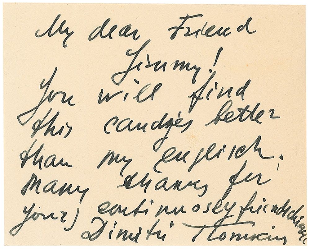 Academy Award–winning composer (1894–1979) of over 140 film scores, including High Noon, Giant, and The Old Man and the Sea. ANS, one page, 4 x 3, Old Vienna letterhead, no date. Brief letter of thanks to a friend. In full (with grammar and spelling retained): “You will find this candyes better than my english. Many thanks fer your continued friendship.” In fine condition.
