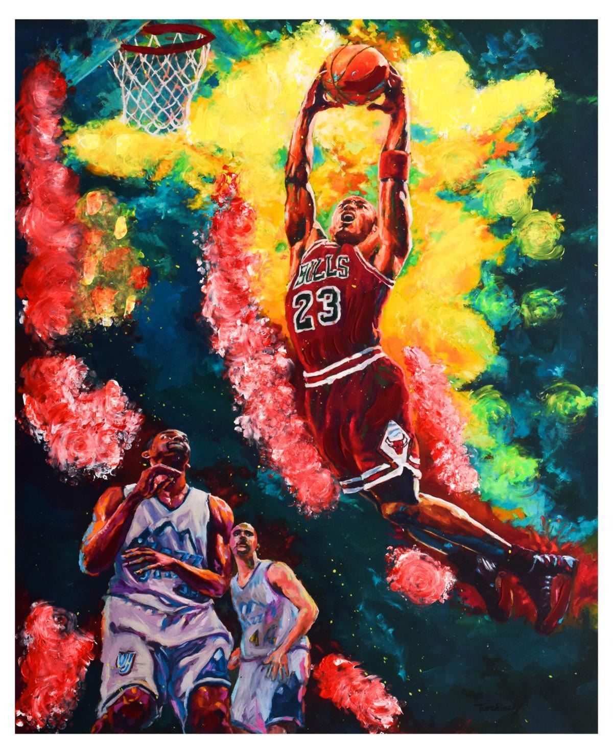 Artist: Dimitry Turchinsky. Medium: Mixed Media. Title: Michael Jordan Dunks. Size (Unframed): 30" x 24". Certificate of Authenticity: From the publisher. Reference# 12989.