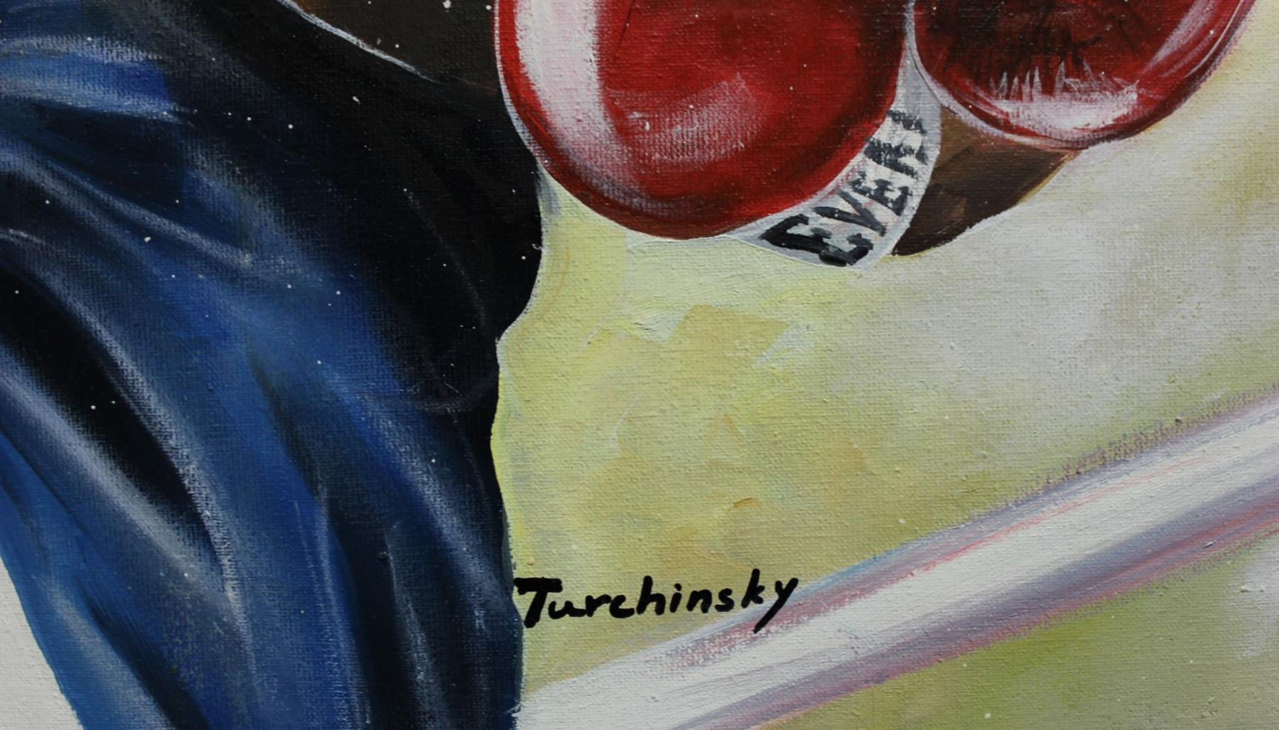 Artist: Dimitry Turchinsky. Medium: Original Oil on Canvas. Title: Ali vs Frazier. Size (Unframed): 20" x 24". Certificate of Authenticity: From the publisher. Additional: Only one of a kind. Reference# 11227.