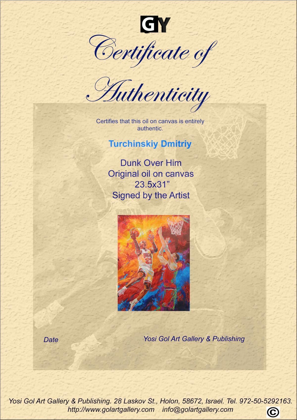 Artist: Dimitry Turchinsky. Medium: Original Oil on Canvas. Title: Dunk Over Him. Size (Unframed): 31" x 23.5". Certificate of Authenticity: From the publisher. Reference# 10201.