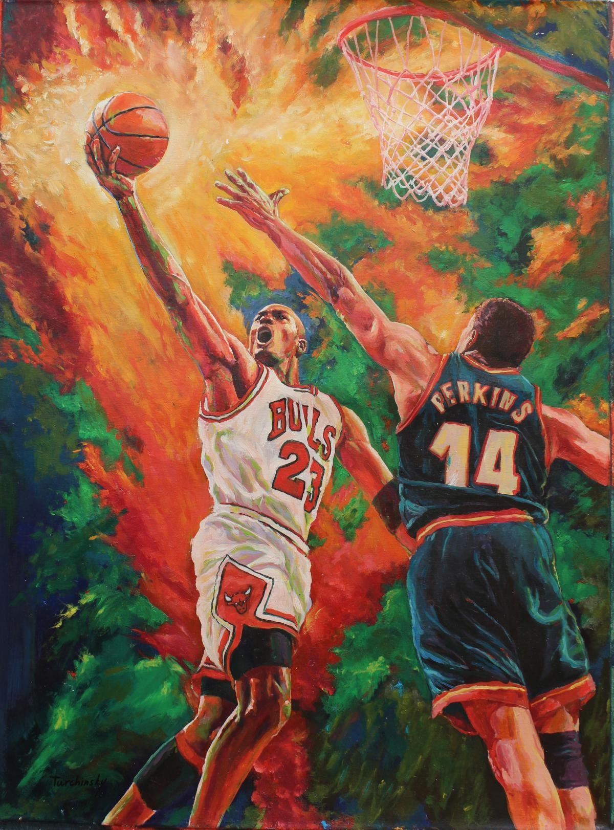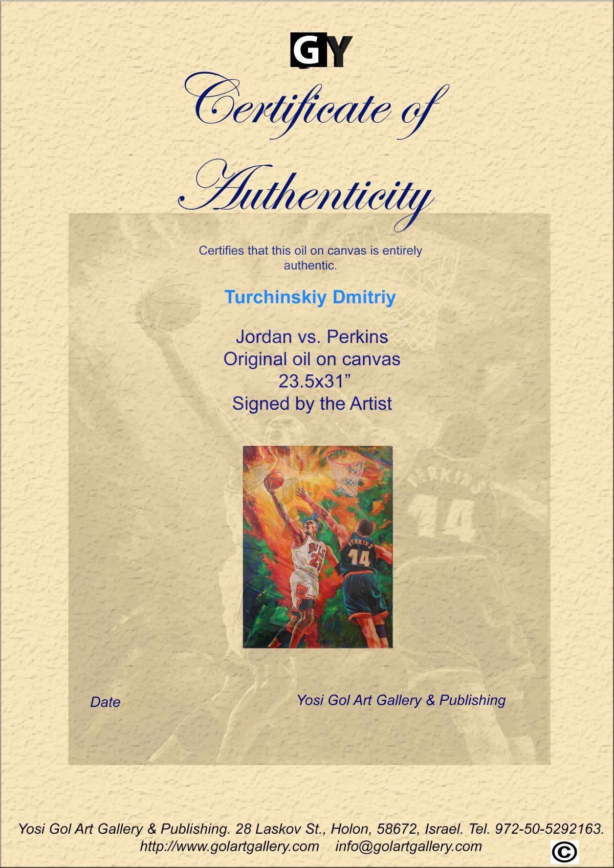 Artist: Dimitry Turchinsky. Medium: Original Oil on Canvas. Title: Jordan vs. Perkins. Size (Unframed): 31" x 23.5". Certificate of Authenticity: From the publisher. Reference# 10200.