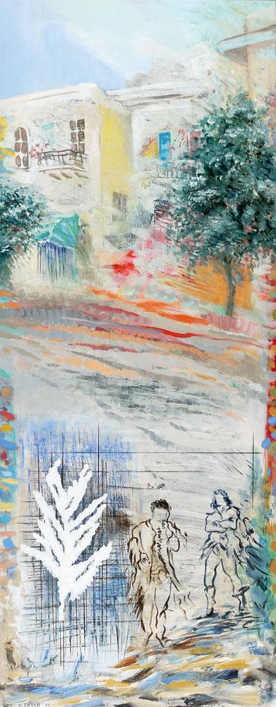 Dina Enoch, Israeli Art, B. 1946, In Old Tel Aviv, 2007, Acrylic on canvas, 130x50cm, Signed and dated., , , , ,