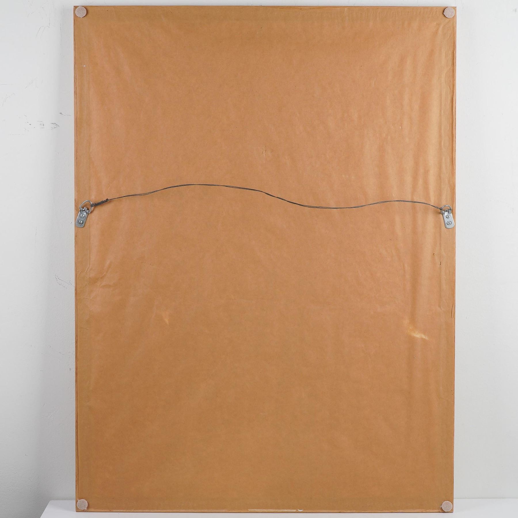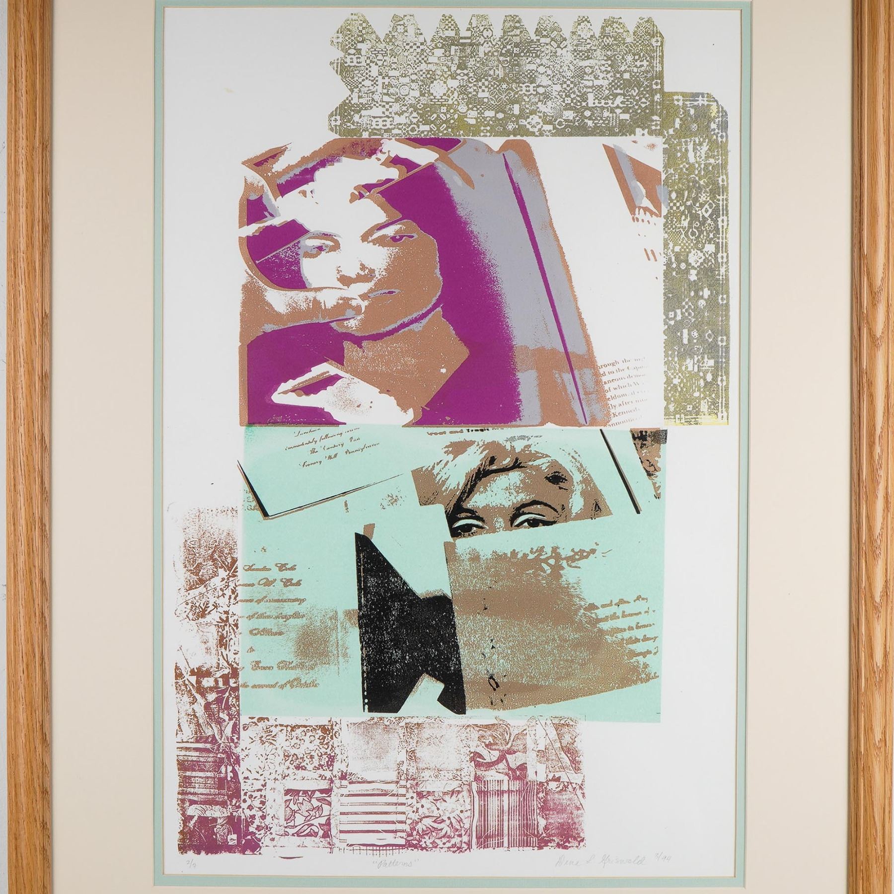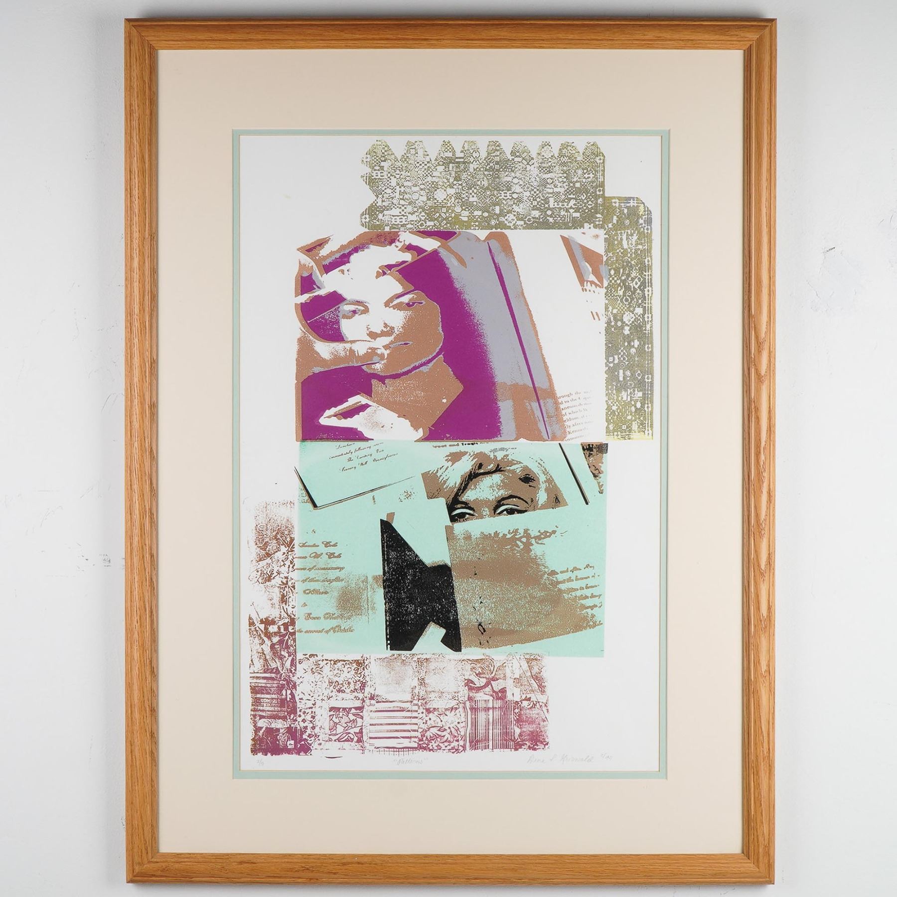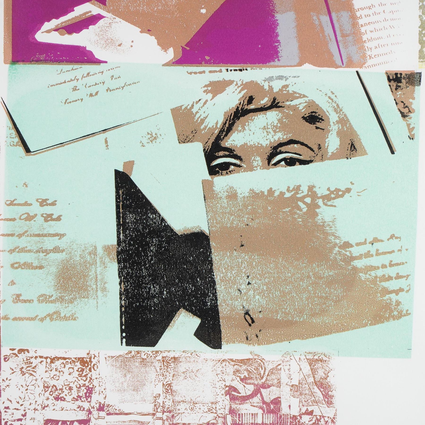 Large color silkscreen on paper by artist Dina L. Griswold titled Patterns, signed and dated lower right and numbered 2/7. The artwork features a layered, collage-style composition with portraits of Jackie Kennedy and Marylin Monroe partially obscured by abstract blocks of text, texture, and pattern, evoking a Pop Art aesthetic with influences from mid-century graphic design and photojournalism. The text elements embedded within the design include references to historical events, such as the Kennedy assassination, adding conceptual depth to the piece. Printed in rich tones of violet, mint green, sepia, and black, the work explores themes of identity, media, and memory through fragmented visuals and juxtaposition. The silkscreen is professionally matted and framed under glass in a natural wood frame.