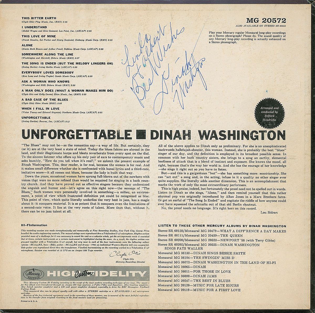 Legendary American singer (1924–1963) dubbed the ‘Queen of the Blues,’ who died of an overdose of sleeping pills at the age of 39. Unforgettable album signed and inscribed on the reverse in blue ballpoint, “To Linda & Albert, Best Wishes, Dinah Washington.” In fine condition, with light overall soiling to reverse. The record is included.