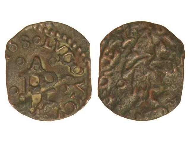 Diner. - (16)68. - LUIS XIV. - PERPINYÀ. - Anv.: Doble P, encima A y anillos. Rev.: San Juan entre anillos. (Algo recortada). Dup-1611. MBC-. - -