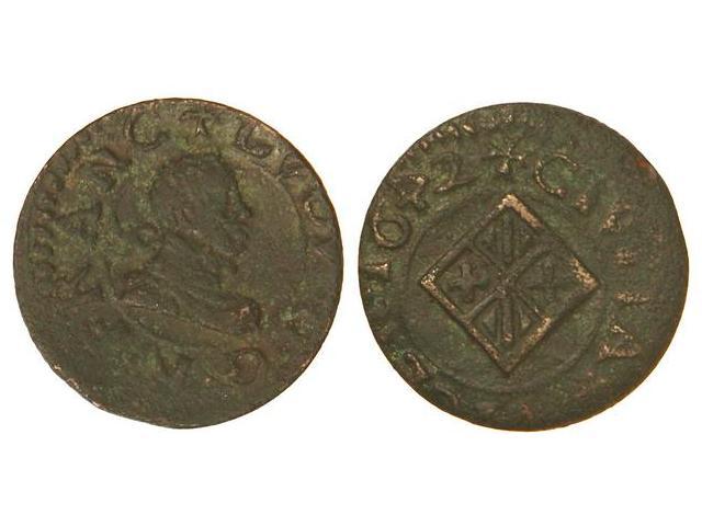 Diner. - 1642. - LLUIS XIII. - VIC. - Anv.: ¶LVDV.D.G.R.FRANC. Busto de Felipe IV. Rev.: ¶CIVITAS.VICEN.1642. El 4 de la fecha invertido. MUY RARA. Cal-No cat.; CruSeg-190b var. MBC+. - -